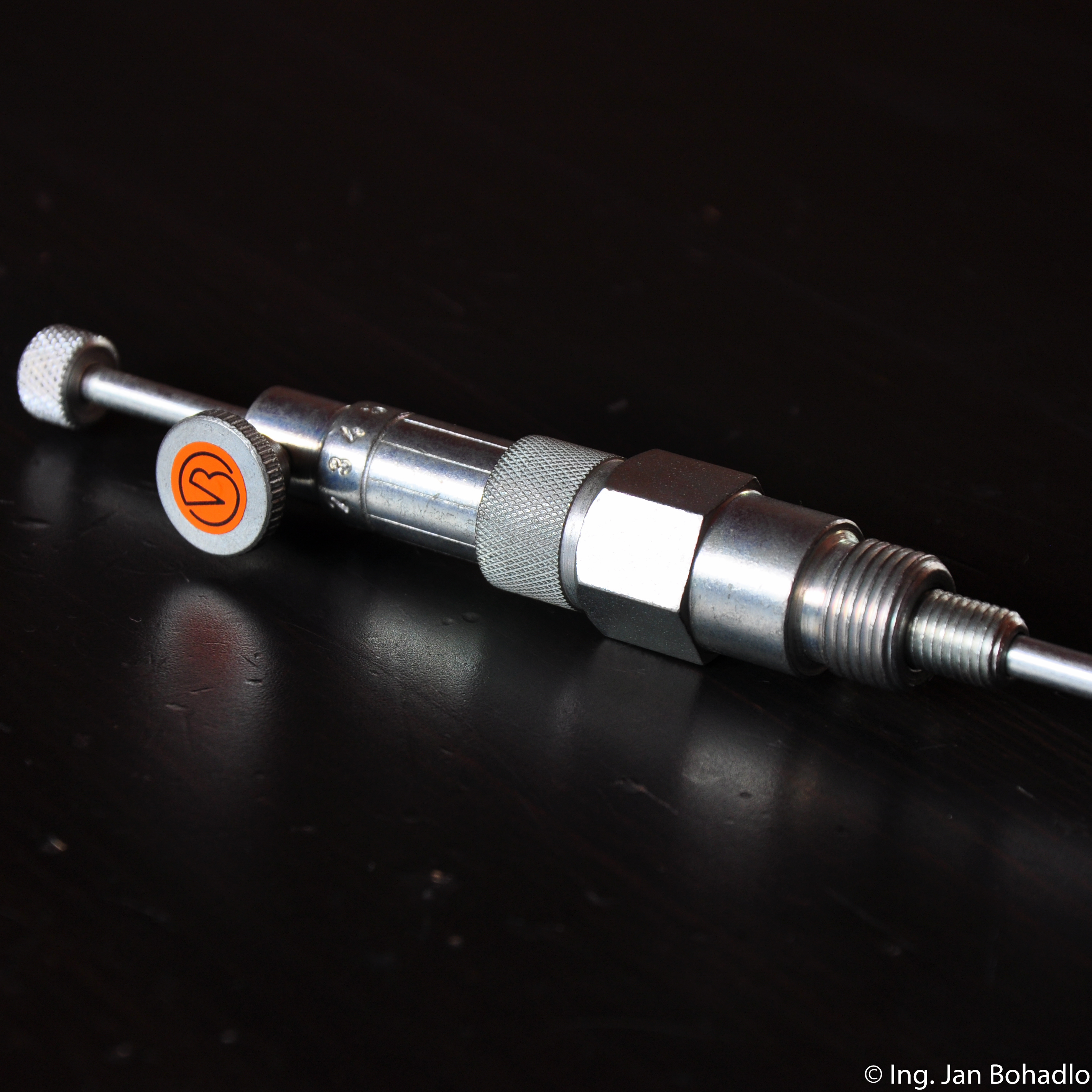 - Přípravek se nejprve otáčením seřídí tak, aby byla čela obou závitů v jedné rovině.